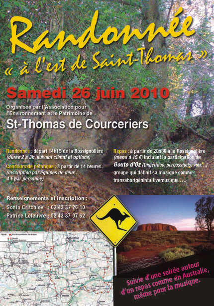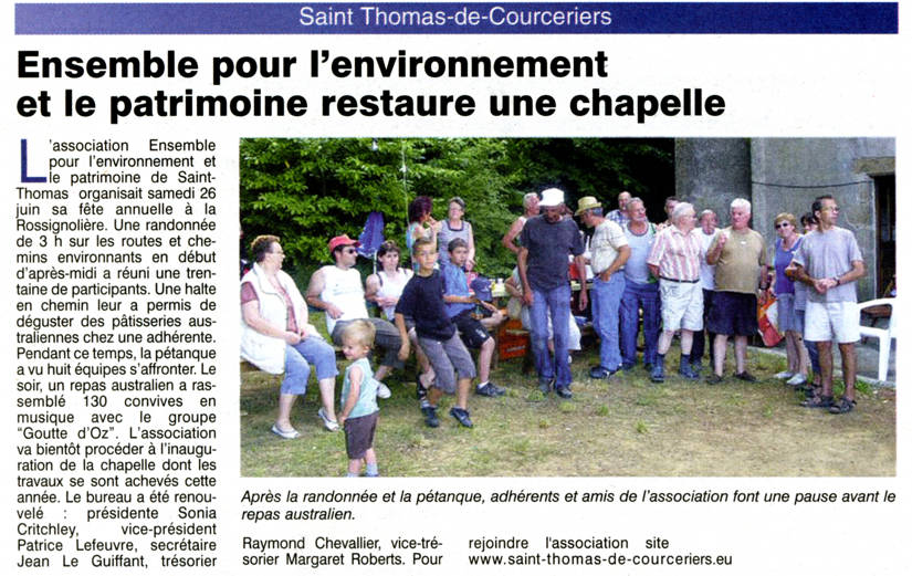 On Saturday 26th June L'association Ensemble pour l'envronnement et le patrimoine de Saint-Thomas organised its annual fête at la Rossignolière. In the early afternoon a three hour country ramble on nearby roads and paths in the early afternoon was attended by about thirty participants. A stop along the way allowed them to savor Australian pastries. Meanwhile, eight teams competed in a pétanque championship. The evening meal was attended by 130 guests with Australian music by the band "A Drop Of Oz". The association will soon inaugurate the Chapel, where the work was completed this year. The Committee has been re-elected. President Sonia Critchley, Vice-President Patrick Lefeuvre, Secretary Jean Le Guiffant, Treasurer Raymond Chevallier, Vice-Treasurer Margaret Roberts. Visit the Association's website at http://www.saint-thomas-de-courceriers.eu |