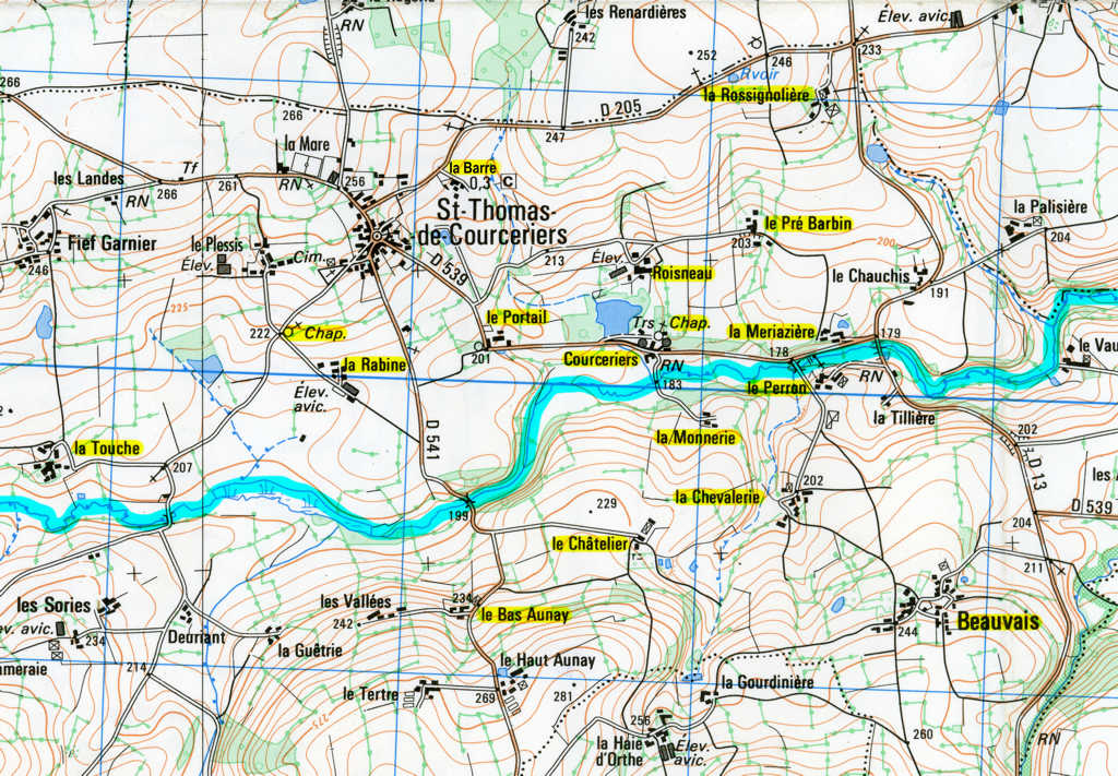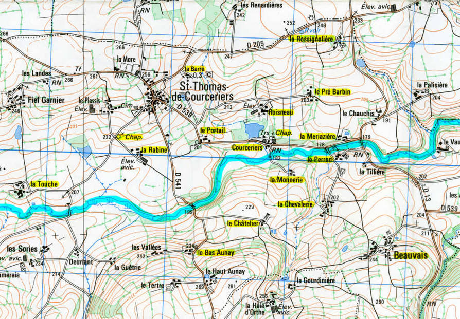 | This map shows the places named in the History of Courceriers and the course of the Vaudelle River. Click on the map to enlarge it. |