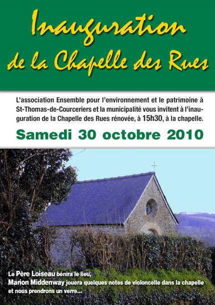 L’association Ensemble pour l’environnement et le patrimoine à St. Thomas and the municipality invited everyone to the inauguration of the renovated Chapel Street on Saturday, October 30th at 15:30, at the chapel. Father Loiseau blessed the place and Marion Middenway, who had performed at a concert to fund the work in 2008 played a selection on the cello inside the chapel. The culmination of a long journey – of joys and challenges, of the renovation done by the volunteers. The story of this renovation began in 2003. Géneviève Marietta, native to the area, participated in a competition in the Pilgrim Magazine "a heritage for tomorrow." A dossier was opened and a book of support collected 130 signatures of residents of the commune and surrounding areas. Genevieve Marietta’s project did not win the competition. The association "Ensemble pour l’environnement … " was created at the same time. The renovation of the chapel as a project of the association was proposed in late 2005 In early 2007, an altar stone was discovered under the old wooden altar. In late March 2007, Gervais Barré, an expert at the Society of Architecture and History of Mayenne (SAHM) gave his opinion on this stone and on the renovation of the chapel. The stone is a 14th century tombstone, which (assumption) must have experienced some incidents since its place of origin, the old church of St Thomas. The council came to see the building and discuss the work with members of the association, specifications and methods of reovation. A agreement in principle on the work and payment for materials by the commune was received by the municipality in May 2008 Time passed, availabilities changed. The work actually began in February 2009. Dismantling the ceiling, fixing battens, lime plaster work and plastering the ceiling and walls of the chapel, then putting on a fine layer of lime finishing plaster, painting niches renovation of the door and making a new circular window. We were now in December 2009. In 2010, we had to redo all the interior finish (scrape off the lime plaster and paint). Finish the floor (a few tiles to put down) and put the circular glass window in place. The chapel was ready at the end of August. Only the refurbishment of the objects remained and to officially give it back to the municipality and the residents of St. Thomas. It was long, sometimes laborious and difficult. But it's done and we are pleased with the progress and outcome. The association wishes to thank all members who participated in this work and especially Marion Middenway for the concert in April 2008, Serge Boulay for his active participation with the work, Mike Gaisford for the time he gave (lime and plaster), Eddie Wade for the restoration of the door and the manufacture of the window, Gerard Filloche for the painting of the niches and two paintings he offered to the chapel and Roger Chauvet for the glazing of the window. |