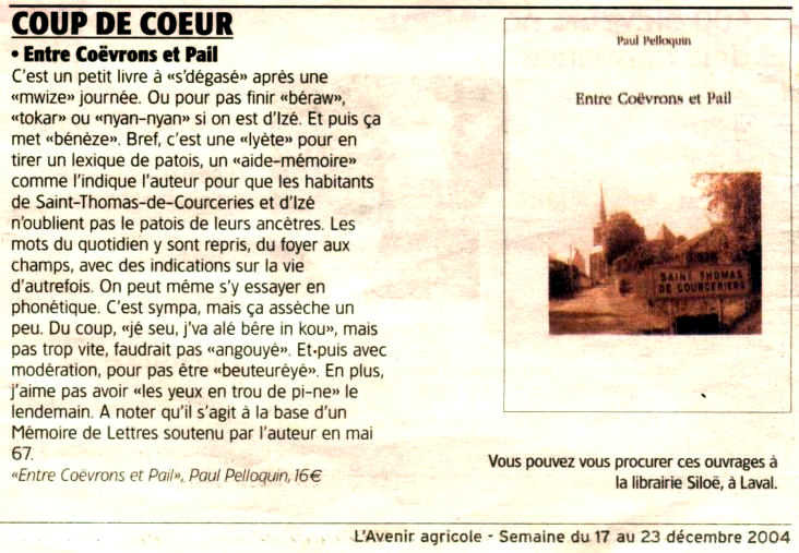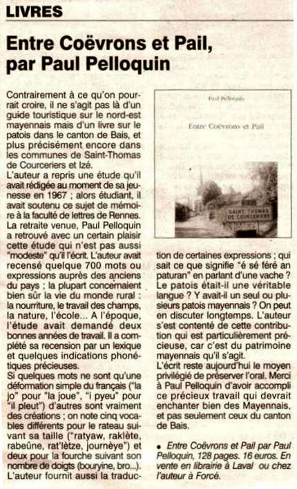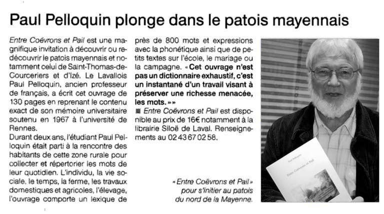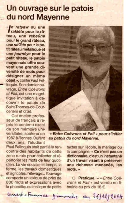 Published Ouest France 15 December 2004 Between Coëvrons and Pail is a wonderful invitation to discover or rediscover Mayenne patois, including that of Saint-Thomas-de-Courceriers and Izé. Laval resident Paul Pelloquin, a former professor of French, wrote this 130 page book based on the contents of his 1967 University of Rennes dissertation. For two years, the student Paul Pelloquin went to meet the residents of this rural area to collect and