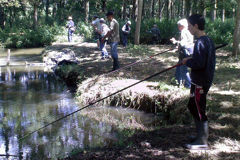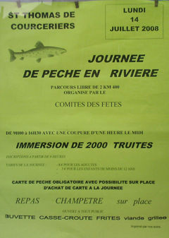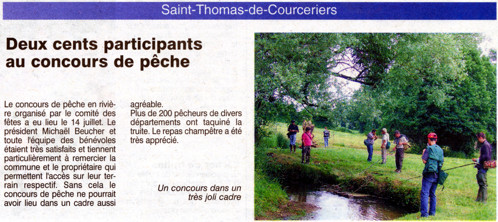 Deux cents participants au journée de pêche Le journée de pêche en rivière organisé par le comité des fêtes a eu lieu le 14 juillet. Le président Michaël Beucher et toute l'équipe des bénévoles étaient très satisfaits et tiennent particulièrement à remercier la commune et le propriétaire qui permettent l'accès sur leur terrain respectif. Sans cela le journée de pêche ne pourrait avoir lieu dans un cadre aussi agréable. Plus de 200 pêcheurs de divers départements ont taquiné la truite. Le repas champêtre a été très apprécié. |