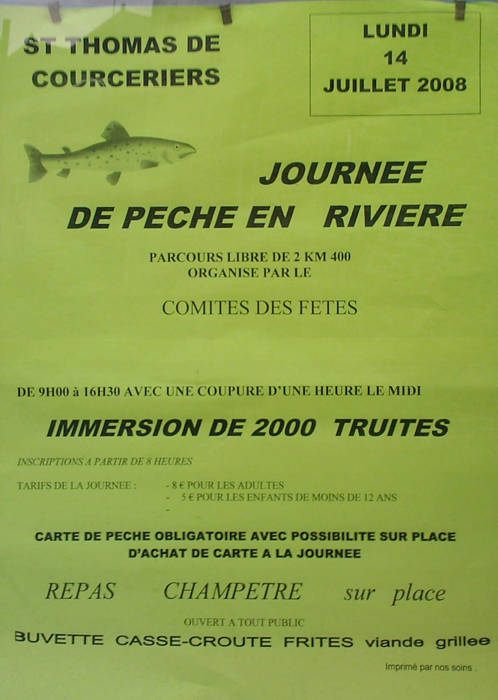 Two hundred participants at fishing day The river fishing day organized by the events committee took place on July 14th. The president Michaël Beucher and all team of the volunteers were very satisfied and would like particularly to thank the village and the owner who allowed access to their respective land. Without it the fishing day could not take place in such an enjoyable setting. More than 200 anglers from various departments played the trout. The rustic meal was very much appreciated. |