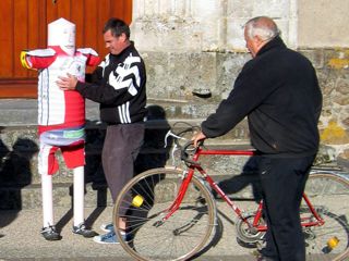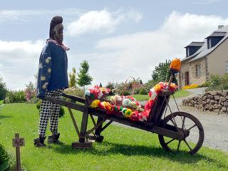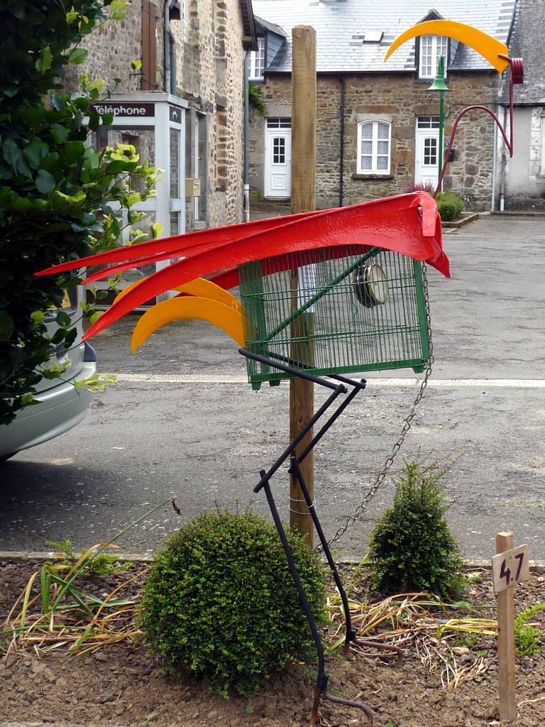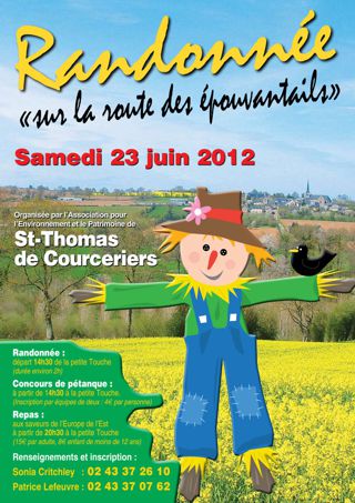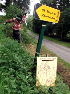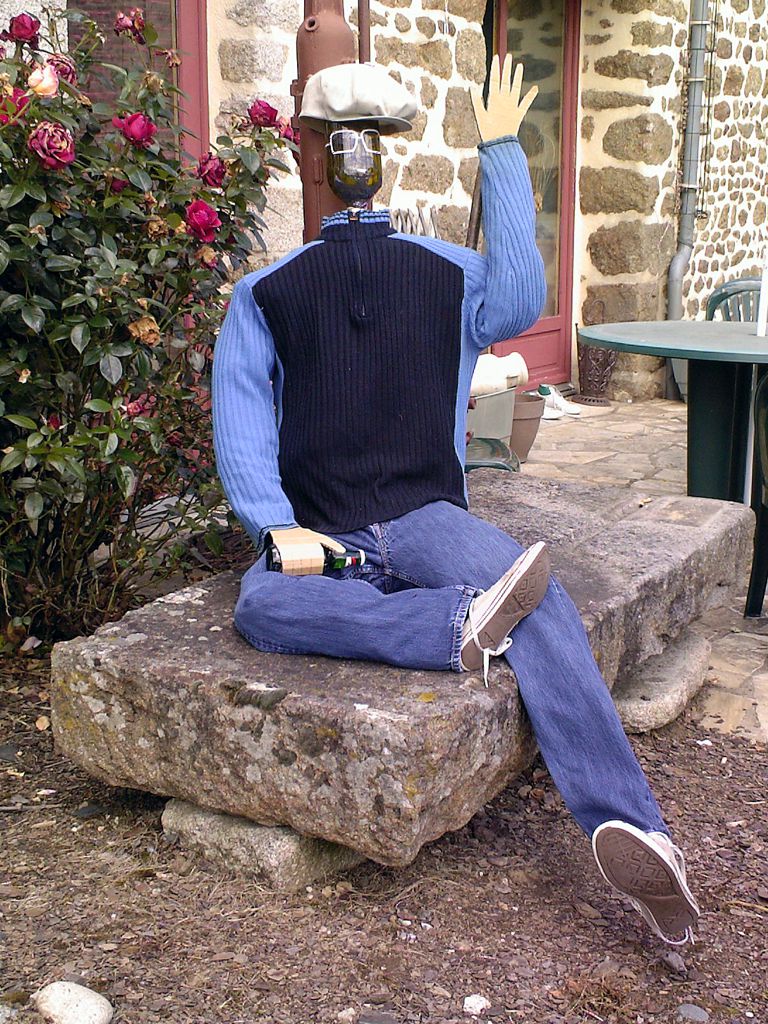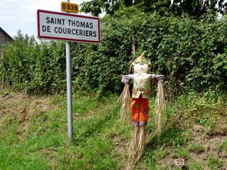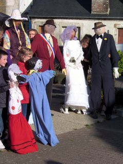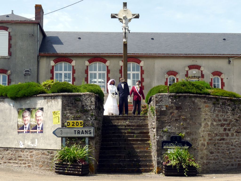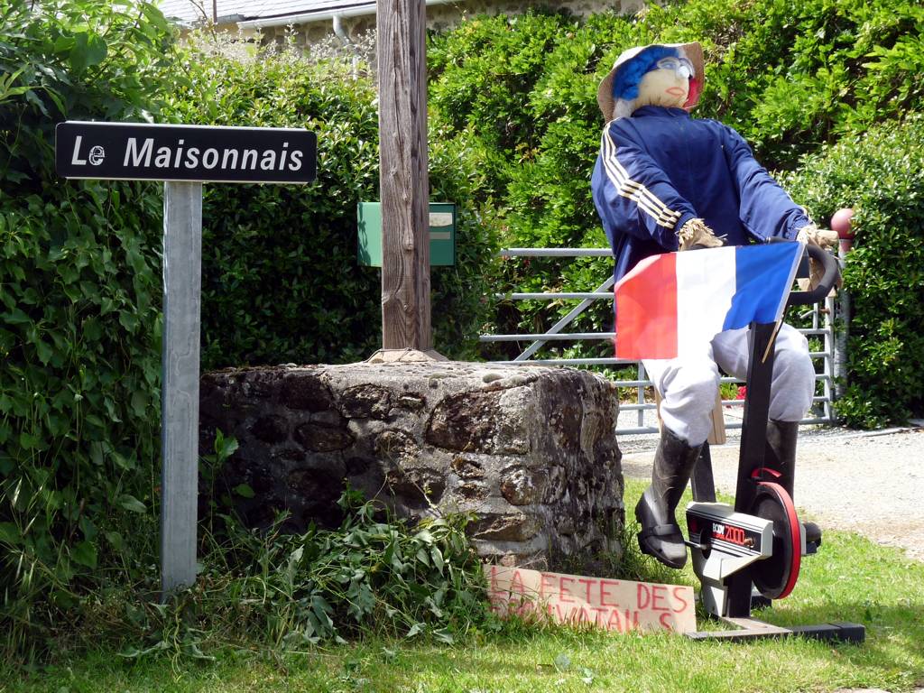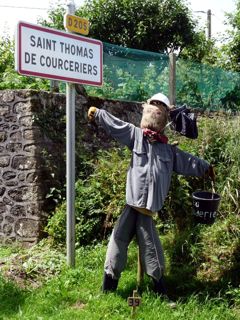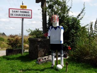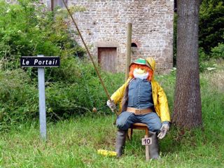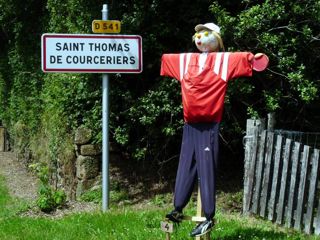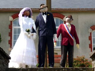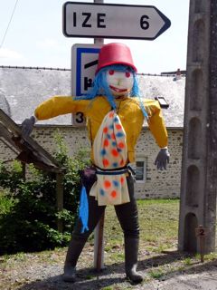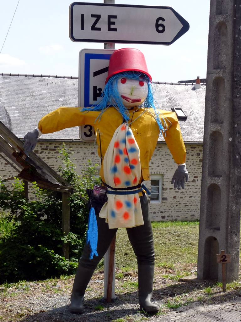 Over fifty scarecrows, and their 250 creators, met last week at the church to make a rambling track to be discovered all summer. A traffic jam in the centre of town was guaranteed! The Comité des Fétes and the Association for the Environment and Heritage are behind the project, which attracted individuals, sports clubs, and school children. All the subjects have been created for fun and are humorous: 'the Mayor and the newly-weds', gardeners, a footballer and other imaginary characters which can be discovered on a marked trail of almost three kilometers running from the town centre in a loop to the rue du Chéne in the direction of la Chapelle du Chéne, then left to 'Le Portail' past the château, the Roman bridge, then left to 'Pre Barbin' and 'Roisneau' before returning to the centre. Last Saturday, the Association for the Environment and Heritage marked the start of the course with a walk from 'La Petite Touche' on the Izé road, and on returning, a petanque competition followed by a meal with flavours of Eastern Europe. A commune where we are never bored!